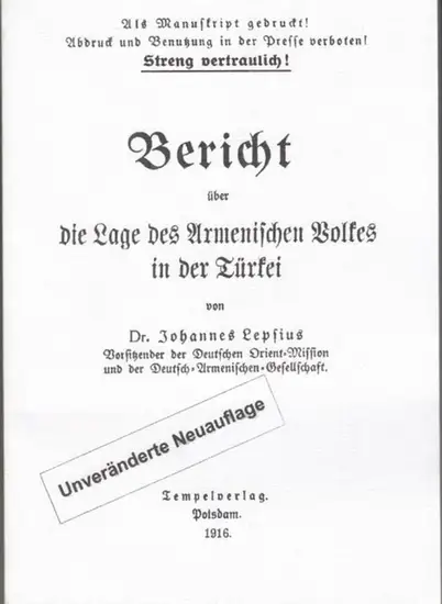 Lepsius, Johannes: Bericht über die Lage des Armenischen Volkes in der Türkei. - Reprint mit dem Originatext der Ausgabe 1916 !.