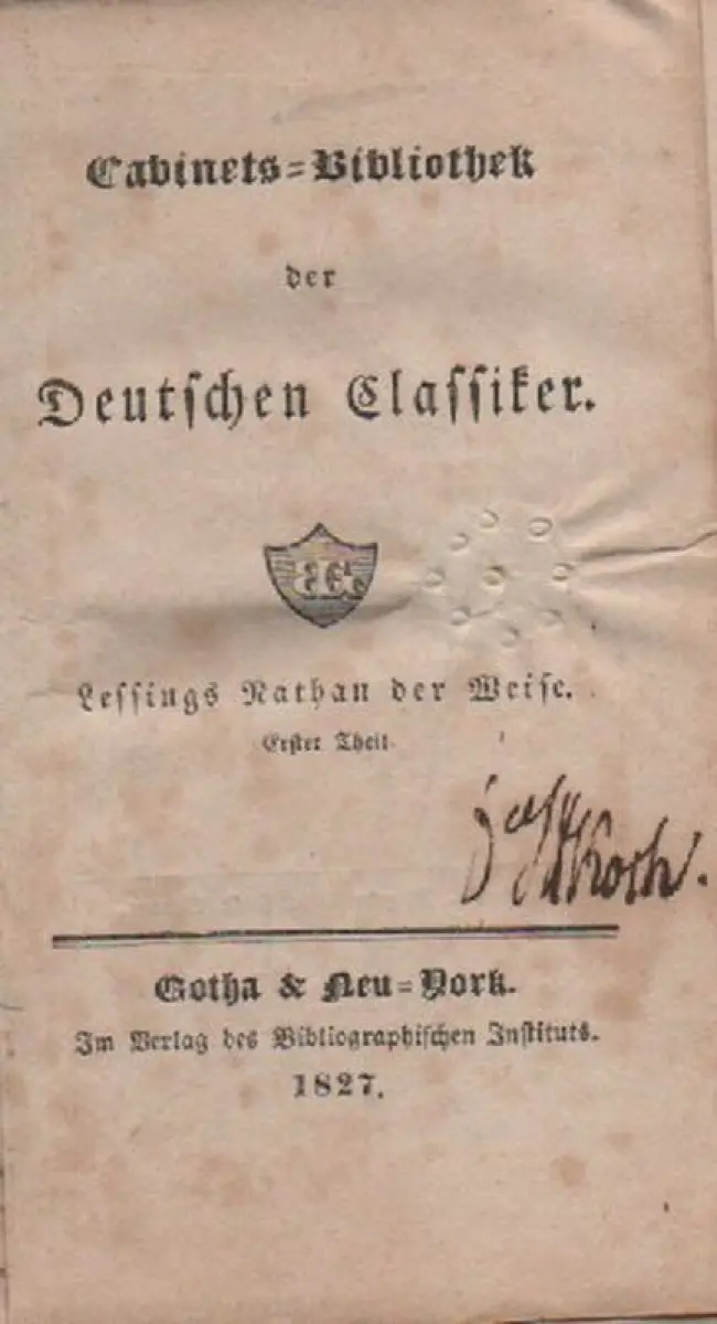 126 S., 124 S., Kleinformat 15 cm, kartonierte Ausgabe der Zeit, mit handschriftlichem Rückentitel, mit Frontispiz 'Porträt von Lessing' (Lithographie), farbiger Kopfschnitt, Fraktur.