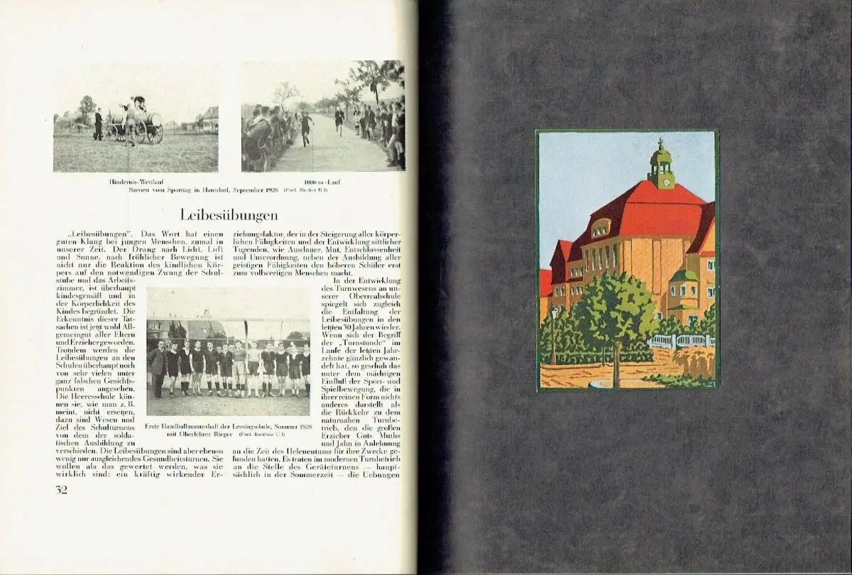 sehr guter Zustand, geringe Gebrauchs- und Alterungsspuren: Einband teils leicht verschmutzt und mit kleinen Randblessuren - Bildtafel rückseitig mit 3 größeren Flecken - Seiten sauber und ordentlich, Architekten der Schule waren die Gebr. Kießling aus Kötzschenbroda (Radebeul) - Geleitwort - Zum 25jährigen Bestehen der Lessingschule - Geschichte der Schule - Die Entwicklung zur Realschule mit Progymnasium - Das eigne Gebäude der Lessingschule - Die Kriegsjahre - Der Ausbau zur Oberrealschule - Das Schulleben der letzten Jahre - Die Ehrentafel - Zwei Briefe aus dem Felde - Schulfeiern - Körperpflege - Leibesübungen - Wanderlied der Lessingschule - Krippenbau — Puppentheater — Laienspiel - Die Pfadfinderbewegung an der Lessingschule - Die V. D. A.-Gruppe an der Lessingschule - Elternabende und Elternrat - Vereinigung Ehemaliger Lessingschüler - Übersichten - Die Entwicklung der Schule - Geburtsorte der Schülerschaft - Wohnorte der Schülerschaft - Berufstätigkeit der Elternschaft - Kamenzer und Auswärtige - Schulgeldsätze - Besuchsziffern der Lessingschule - Stundentafel - Personenverzeichnisse - Schulkommission - Lehrerschaft - Elternrat - Schülerschaft - Schlußwort, kartoniert, ca. 22,5 x 28,5, 71 Seiten mit einigen Bildern und 1 Farbbildtafel
