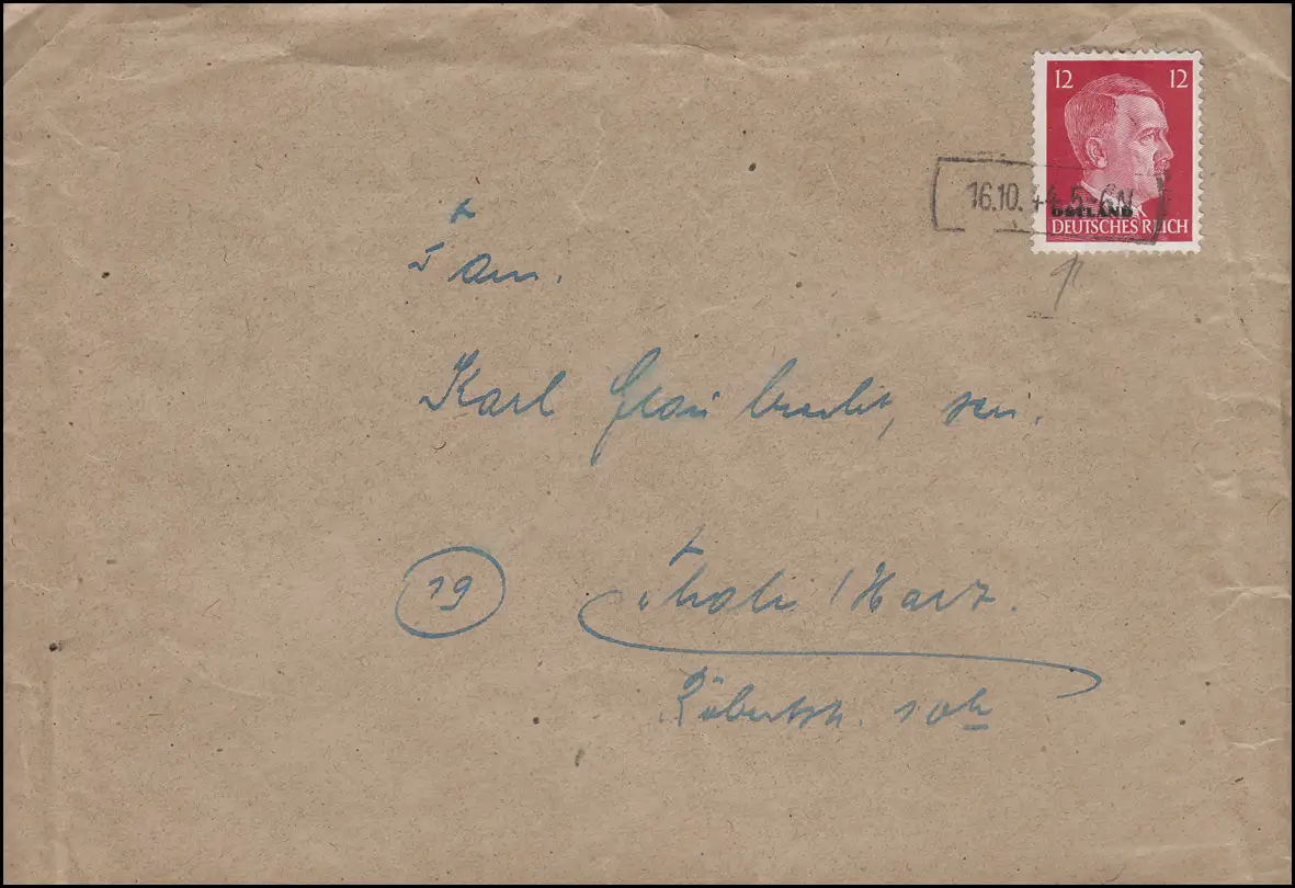 Lettre avec EF 12 Pf de Magdeburg avec date-tampon dans le cadre 16.10.44 n. Thale