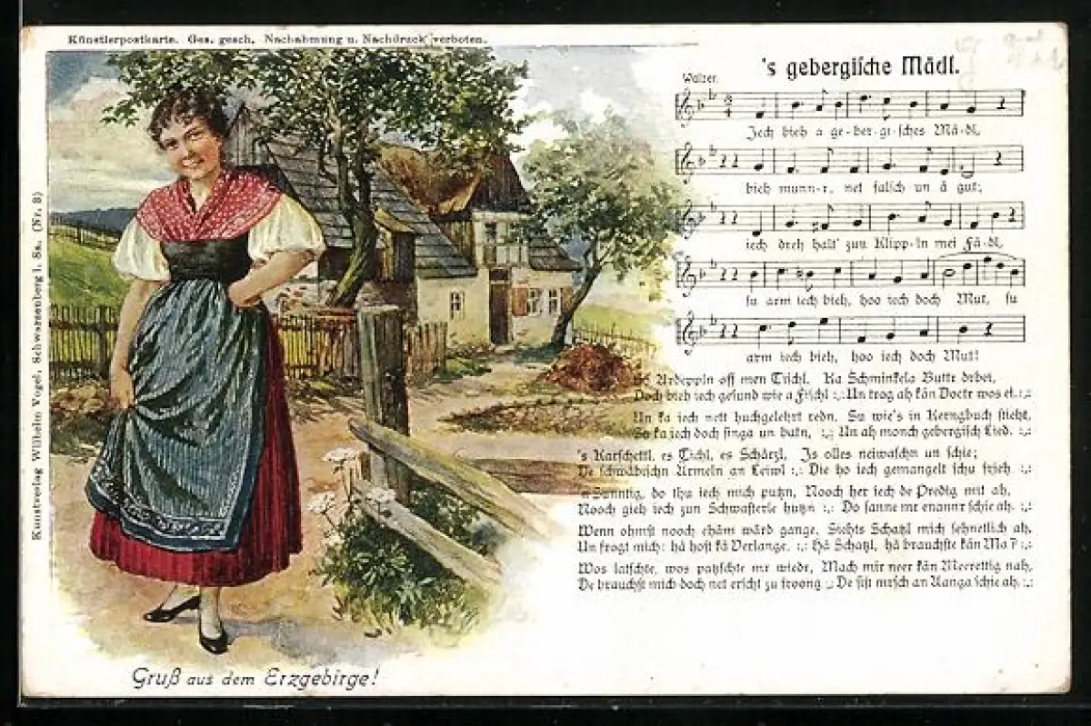 Lied-AK s gebergische Mädl, Junge Bäuerin in Tracht aus dem Erzgebirge