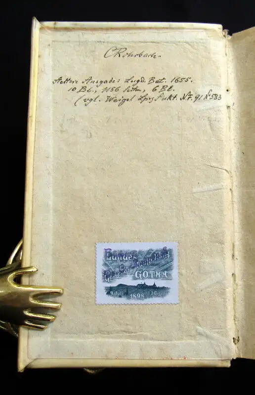 Einband berieben, bestoßen und leicht angschmutzt, hs. Rs., roter Rundumschnitt, Spiegel und Vorsatz mit hs. Vermerken sowie einer alten Briefmarke, Papier altersbedingt gebräunt