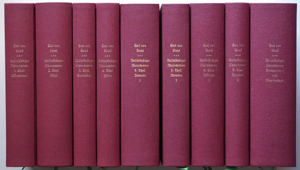 [Systema naturae, dt.]. - Eines von 150 numerierte Ausgaben der limitierten Auflage. - [1] Von den säugenden Thieren; [2.] Von den Vögeln; [3.] Von den Amphibien; [4.] Von den Fischen; [5,1 und 5,2] Von den Insecten; [6,1 und 6,2] Von den Würmern SOWIE Supplements-und Register-Band über alle sechs Theile oder Classen des Thierreichs. - Ein Deckel mit schmalem Lichtrand, sonst gut und sauber -- wie ungelesen. Zusammen 9 Bände