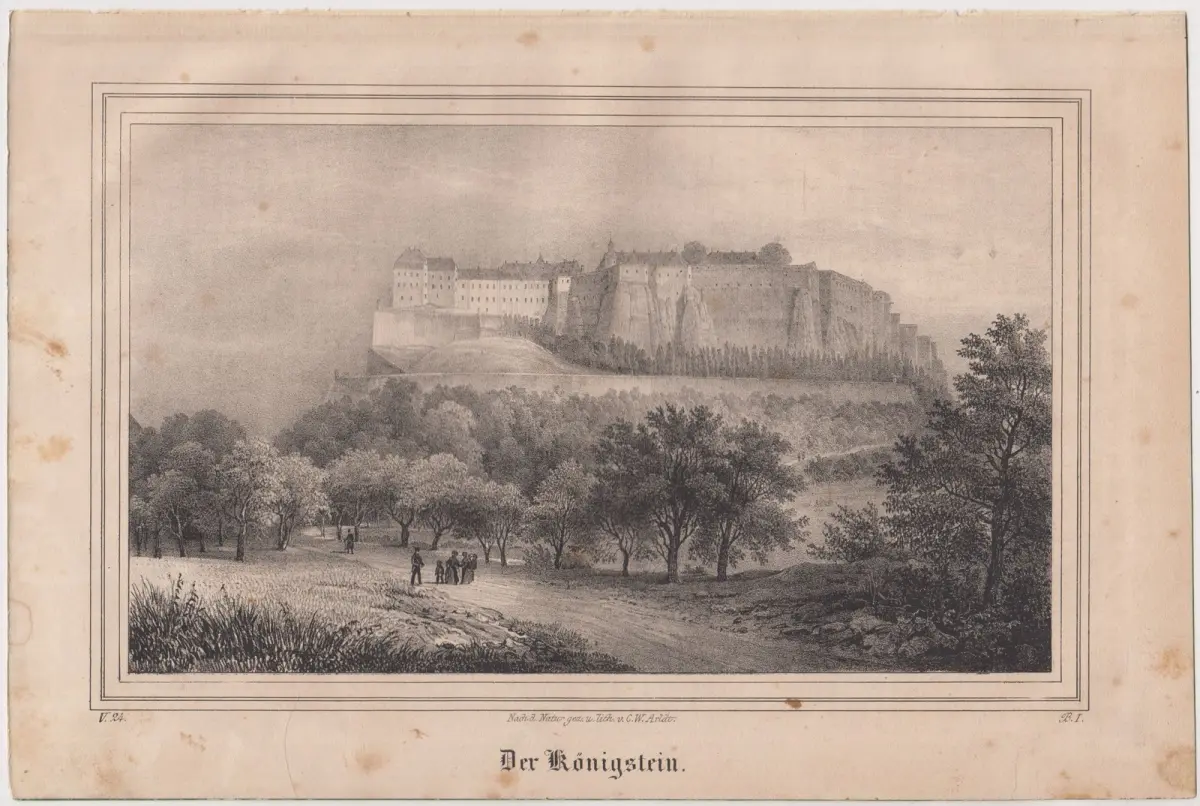 Bemerkungen: Zustand: Lithografie altersbedingt gebräunt und etwas fleckig // Kreidelithografie aus dem Buch Saxonia, mittig betitelt. Motivmaß 14,5 x 23,0 cm. Das Werk "Saxonia: Museum für sächsische Vaterlandskunde" ist ein bedeutendes Sammelwerk des 19. Jahrhunderts, das sich der Dokumentation und Darstellung der sächsischen Kultur, Geschichte, Natur und Landschaft widmet. Es wurde mit dem Ziel veröffentlicht, ein umfassendes "Museum auf Papier" zu schaffen, das das kulturelle und wissenschaftliche Erbe Sachsens zugänglich macht. Das Buch vereint topografische, geschichtliche, archäologische und naturwissenschaftliche Inhalte und ist mit aufwendigen Kupferstichen oder Lithografien illustriert. Es richtet sich an Leser, die sich für das reiche kulturelle Erbe Sachsens interessieren und ist gleichzeitig ein Zeugnis der romantischen Begeisterung für Heimatkunde und Vaterlandsliebe.