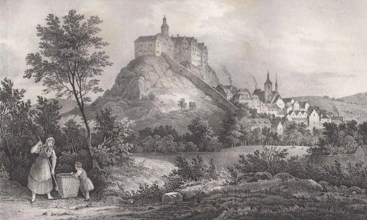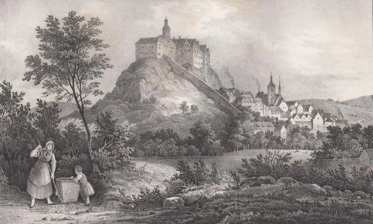 Bemerkungen: Zustand: Lithografie altersbedingt etwas gebräunt und etwas fleckig // Kreidelithografie aus dem Buch Saxonia, mittig betitelt. Bildformat 14,0 x 21,0 cm. Das Werk "Saxonia: Museum für sächsische Vaterlandskunde" ist ein bedeutendes Sammelwerk des 19. Jahrhunderts, das sich der Dokumentation und Darstellung der sächsischen Kultur, Geschichte, Natur und Landschaft widmet. Es wurde mit dem Ziel veröffentlicht, ein umfassendes "Museum auf Papier" zu schaffen, das das kulturelle und wissenschaftliche Erbe Sachsens zugänglich macht. Das Buch vereint topografische, geschichtliche, archäologische und naturwissenschaftliche Inhalte und ist mit aufwendigen Kupferstichen oder Lithografien illustriert. Es richtet sich an Leser, die sich für das reiche kulturelle Erbe Sachsens interessieren und ist gleichzeitig ein Zeugnis der romantischen Begeisterung für Heimatkunde und Vaterlandsliebe.