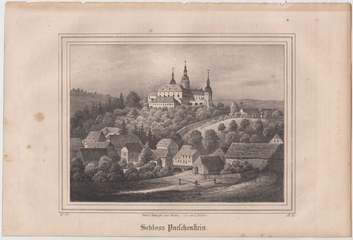 Bemerkungen: Zustand: Lithografie altersbedingt etwas gebräunt und etwas fleckig // Kreidelithografie aus dem Buch Saxonia, mittig betitelt. Motivmaß 14,5 x 18,5 cm. Das Werk "Saxonia: Museum für sächsische Vaterlandskunde" ist ein bedeutendes Sammelwerk des 19. Jahrhunderts, das sich der Dokumentation und Darstellung der sächsischen Kultur, Geschichte, Natur und Landschaft widmet. Es wurde mit dem Ziel veröffentlicht, ein umfassendes "Museum auf Papier" zu schaffen, das das kulturelle und wissenschaftliche Erbe Sachsens zugänglich macht. Das Buch vereint topografische, geschichtliche, archäologische und naturwissenschaftliche Inhalte und ist mit aufwendigen Kupferstichen oder Lithografien illustriert. Es richtet sich an Leser, die sich für das reiche kulturelle Erbe Sachsens interessieren und ist gleichzeitig ein Zeugnis der romantischen Begeisterung für Heimatkunde und Vaterlandsliebe.