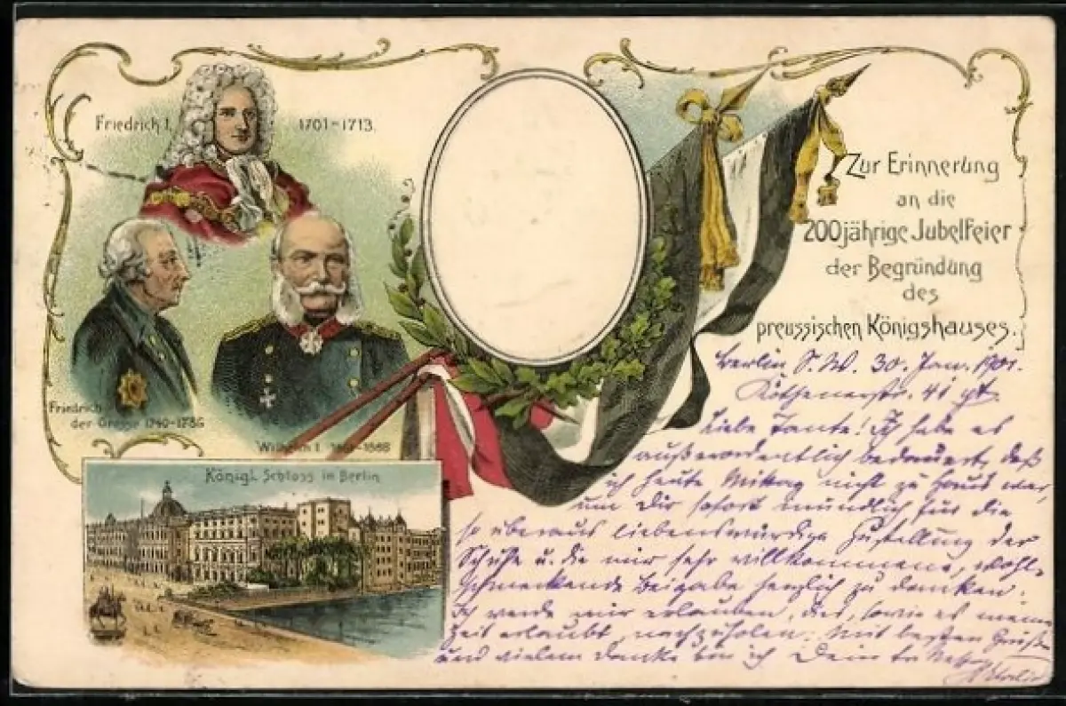 Lithographie 200 Jahre Begründung des preuss. Königshauses, König Friedrich II., Schloss, Fahnen