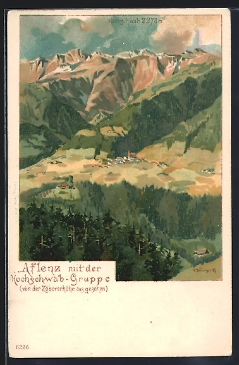 Lithographie Aflenz, Ortsansicht mit der Hochschwab-Gruppe