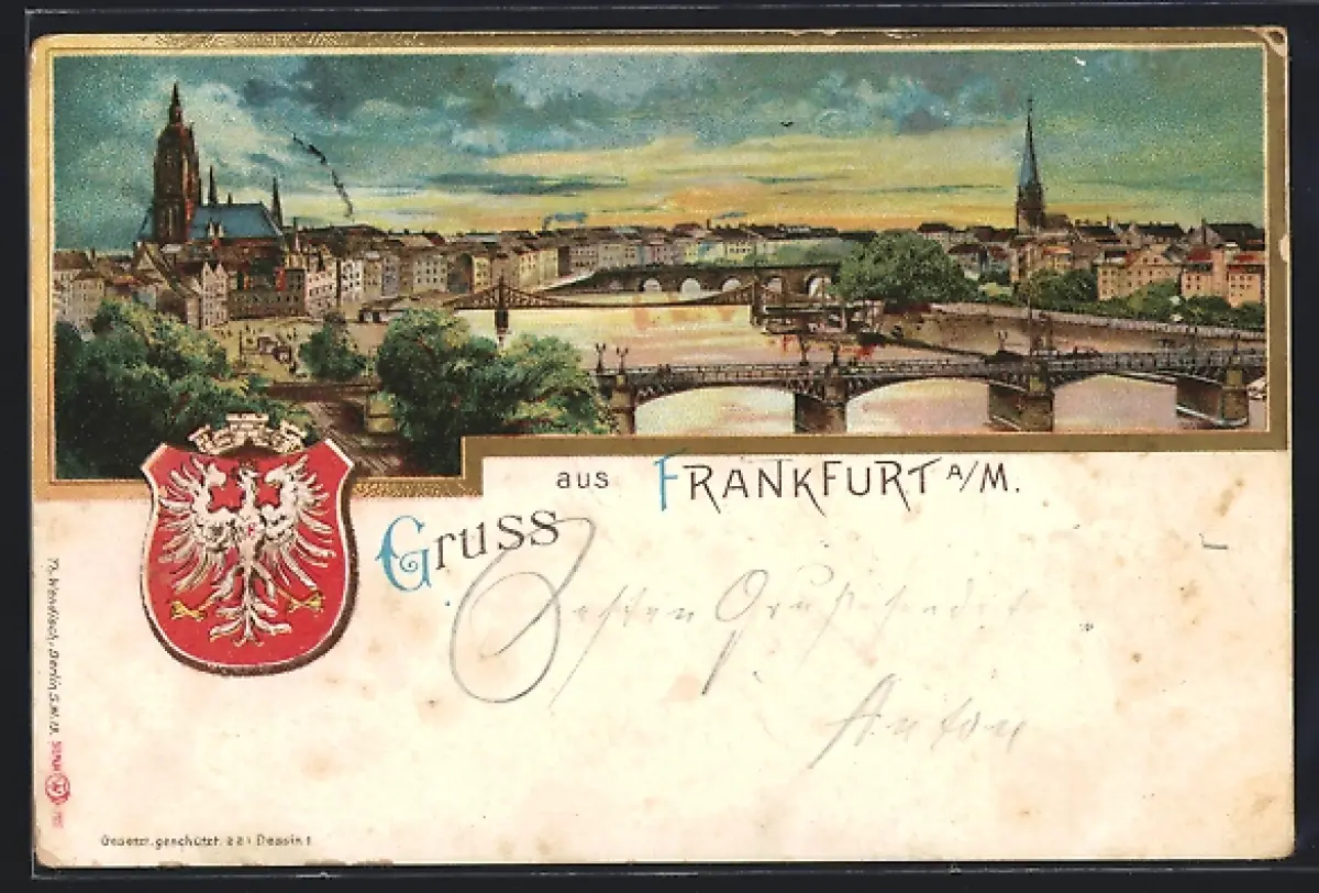 Lithographie Alt-Frankfurt, Stadtansicht mit Dom, Brücke und Wappen