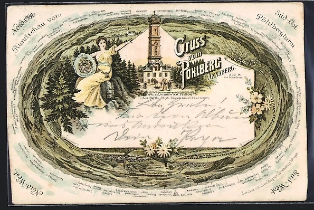 Lithographie Annaberg / Erzgebirge, Rundblick vom Pöhlberg mit Aussichtsturm