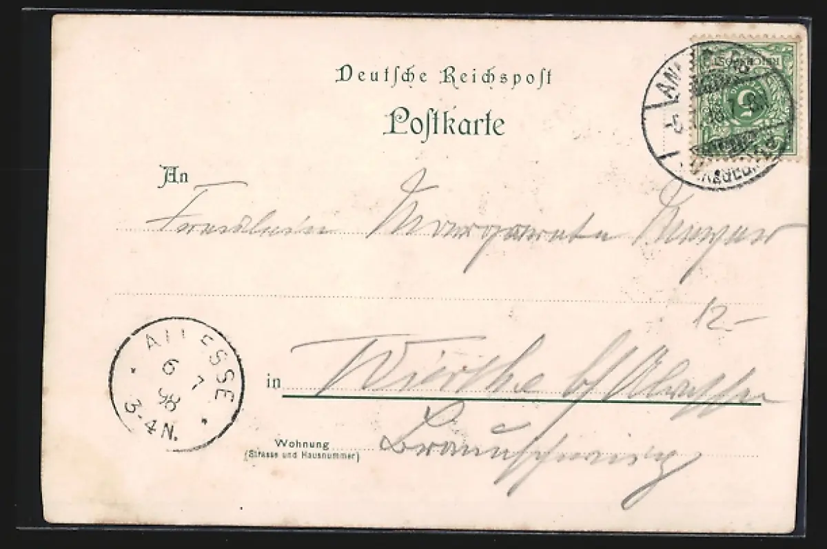 Personenbezogene Daten auf der Rückseite der Karte wurden durch blauen Textmarker unkenntlich gemacht. Die blauen Stellen sind auf die Vorderseite durchgeweicht und wirken sich negativ auf das Postkartenfoto aus