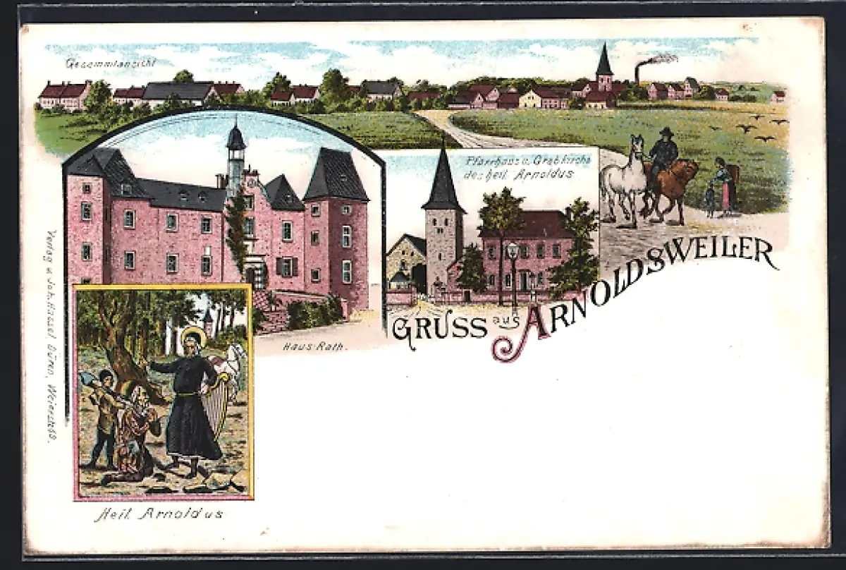 Lithographie Arnoldsweiler, Pfarrhaus u. Grabkirche des heil. Arnoldus, Portrait Heil. Arnoldus, Totalansicht