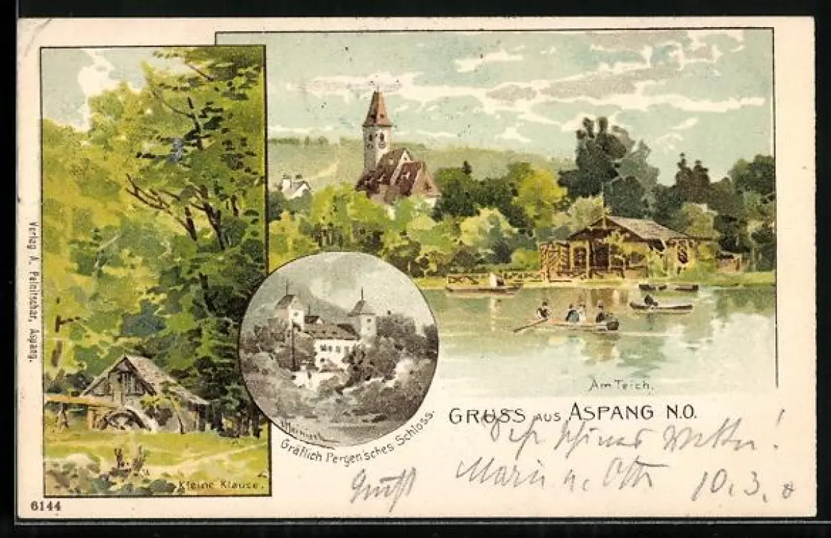 Lithographie Aspang, Kleine Klause, Gräflich Pergen`sches Schloss, Partie am Teich