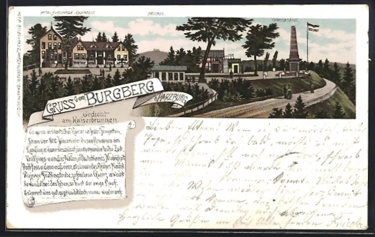 Lithographie Bad Harzburg, Hotel Burgberg mit Brocken und Canossasäule
