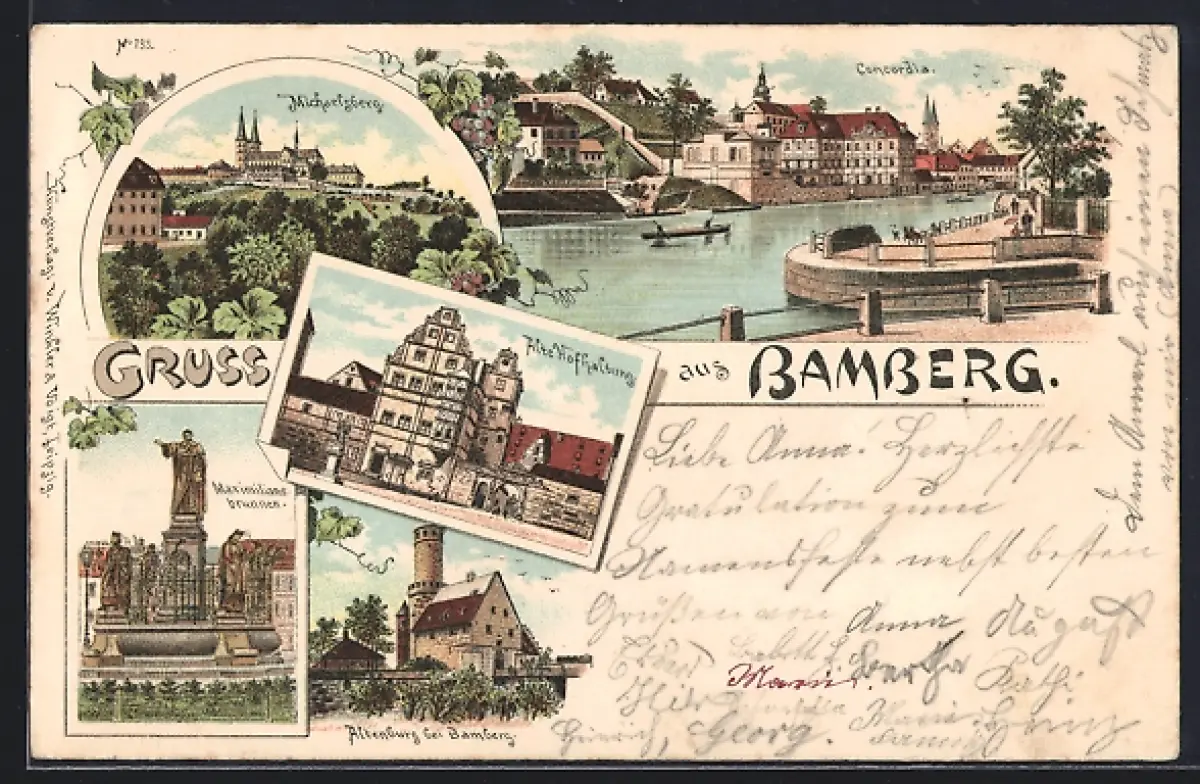 Lithographie Bamberg, Michelsberg, Concordia, Maximiliansbrunnen, Mauthaus, Rathaus