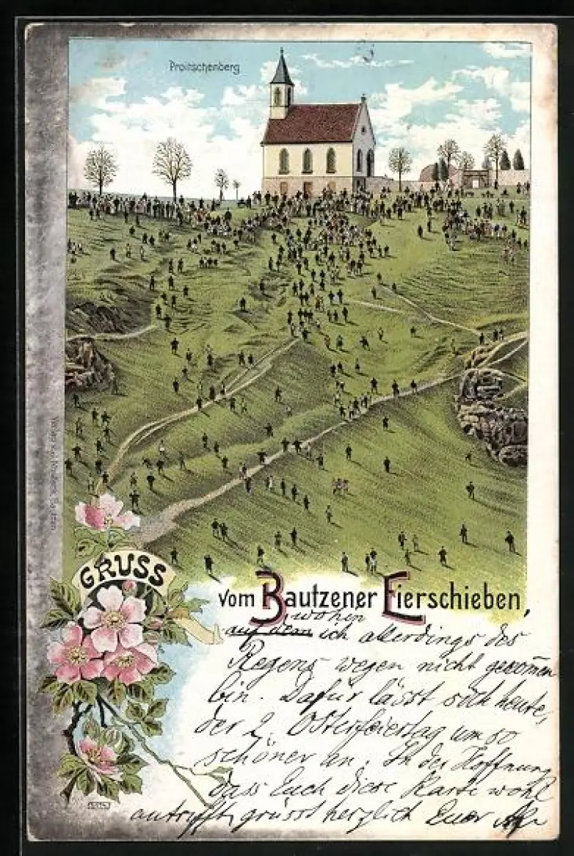 Lithographie Bautzen, Eierschieben an der Kirche auf dem Proitschenberg