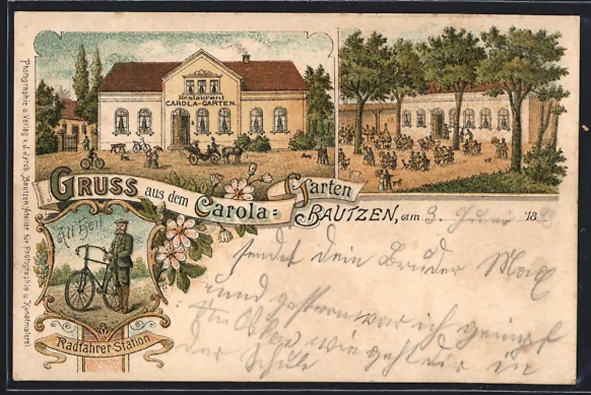 Lithographie Bautzen, Gasthaus Carola-Garten, Radfahrer-Station