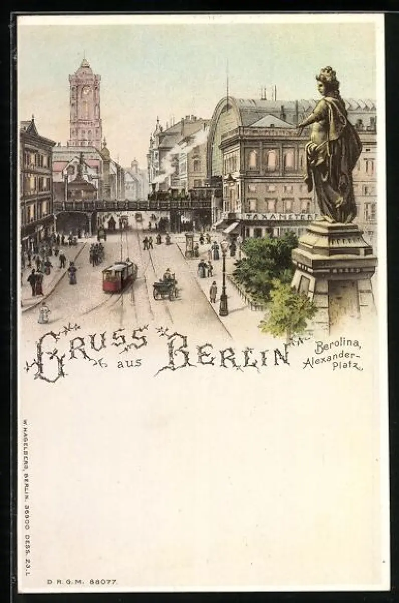 Lithographie Berlin, Berolina am Alexanderplatz mit Strassenbahn, beleuchtete Fenster, Halt gegen das Licht