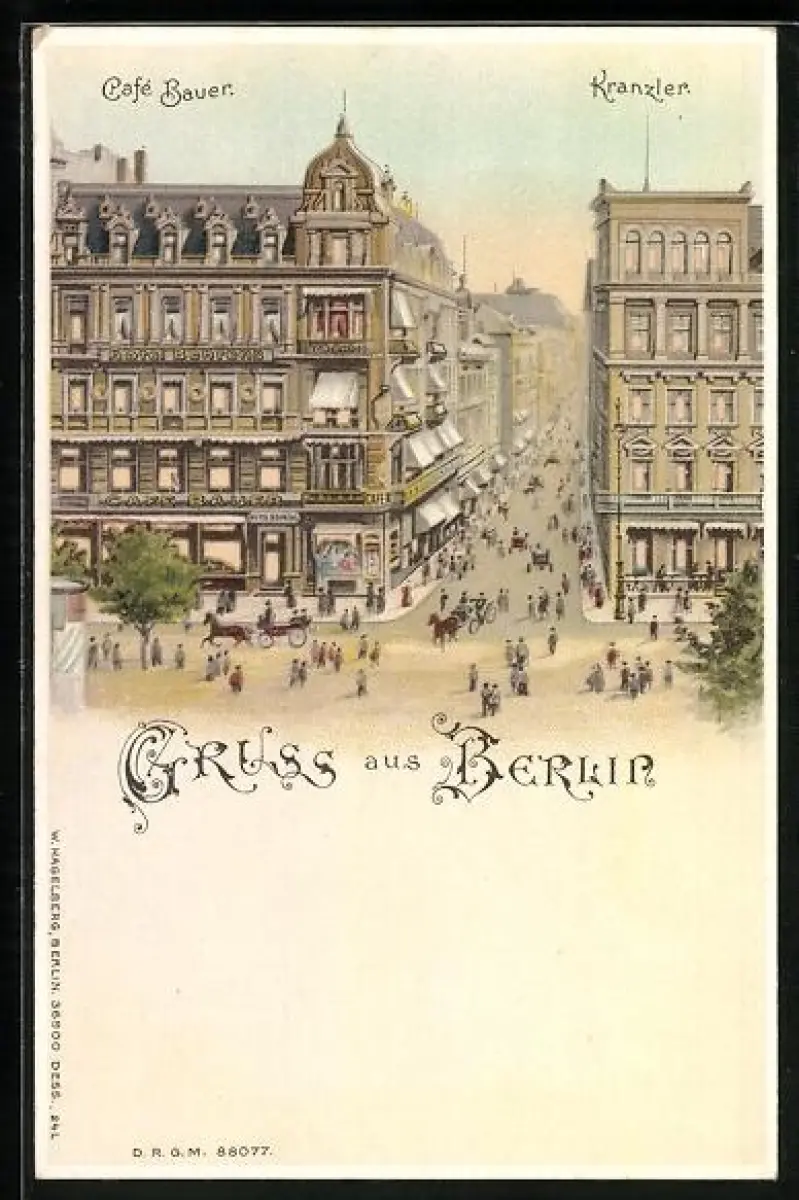 Lithographie Berlin, Cafe Bauer und Kranzler m. beleuchteten Fenstern, Halt gegen das Licht