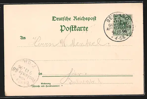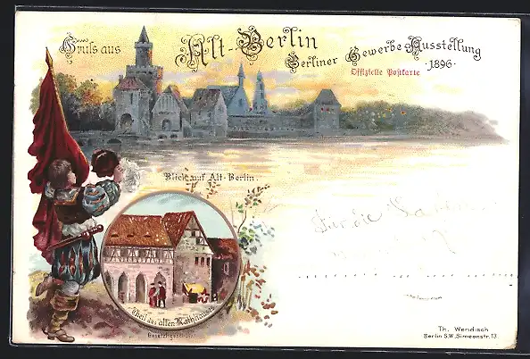 Lithographie Berlin, Gewerbe-Ausstellung 1896, Alt-Berlin, Mann mit Fahne