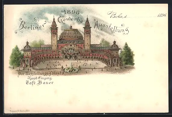 Lithographie Berlin, Gewerbe-Ausstellung 1896, Ausstellung-Palast, Haupteingang, Cafe Bauer