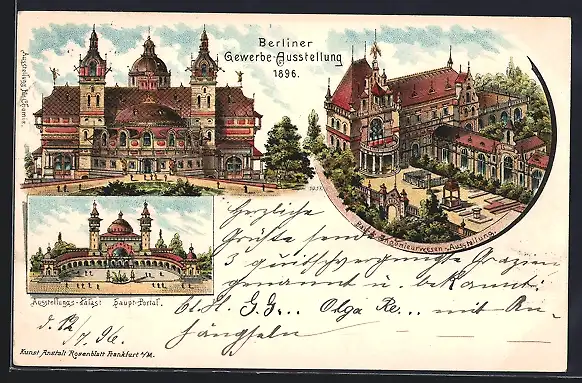 Lithographie Berlin, Gewerbe-Ausstellung 1896, Ausstellungs-Palast, Bau & Ingenieurs-Ausstellung