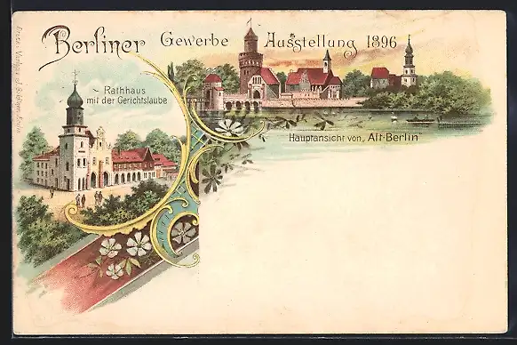 Lithographie Berlin, Gewerbe Ausstellung 1896, Hauptansicht von Alt-Berlin, Rathaus mit der Gerichtslaube