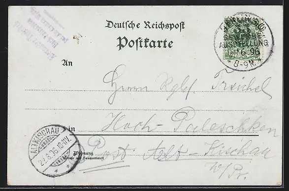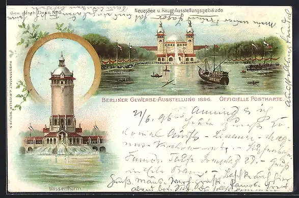 Lithographie Berlin, Gewerbe-Ausstellung 1896, Neuer See u. Haupt-Ausstellungsgebäude