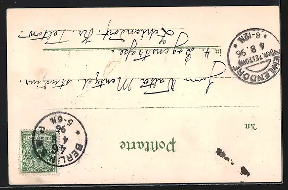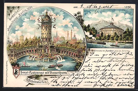 Lithographie Berlin, Gewerbe-Ausstellung 1896, Panorama der Alpenfahrt n. d. Zillertal, Haupt-Restaurant m. Wasserturm