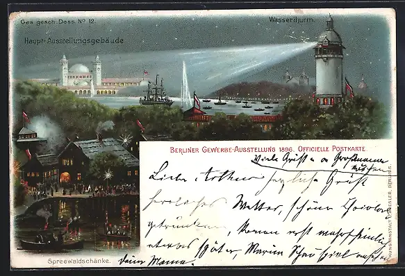 Lithographie Berlin, Gewerbe-Ausstellung 1896, Spreewaldschänke, Wasserturm, Haupt-Ausstellungsgebäude