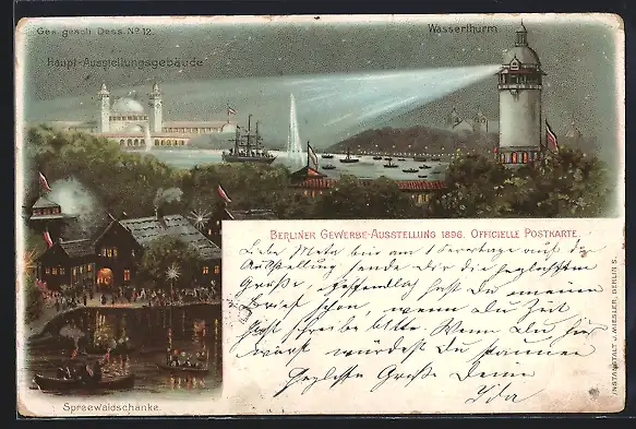 Lithographie Berlin, Gewerbe-Ausstellung 1896, Spreewaldschänke, Wasserturm, Haupt-Ausstellungsgebäude