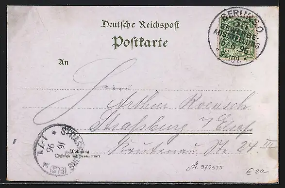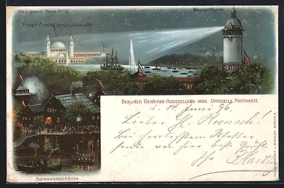 Lithographie Berlin, Gewerbe-Ausstellung 1896, Spreewaldschänke, Wasserturm, Haupt-Ausstellungsgebäude