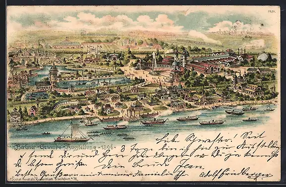 Lithographie Berlin, Gewerbe-Ausstellung 1896, Totalansicht vom Ausstellungsgelände