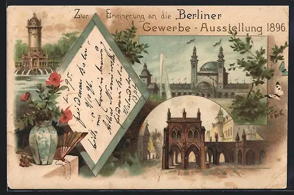 Lithographie Berlin, Gewerbe-Ausstellung 1896, Turm, Ausstellungshalle