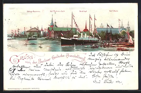 Lithographie Berlin, Gewerbe-Ausstellung, Gebirgs-Panorama, Geb. f. Chemie