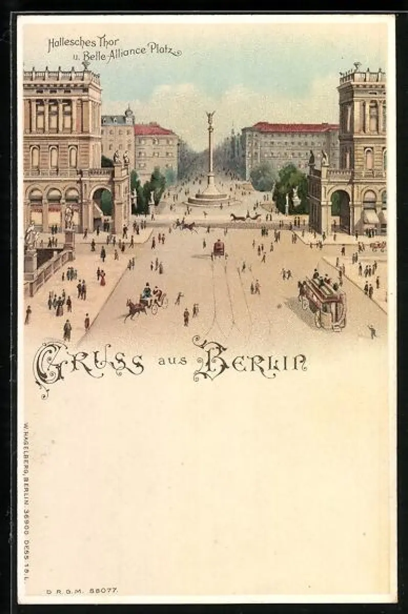 Lithographie Berlin, Hallesches Thor und Belle-Alliance-Platz mit leuchtenden Fenstern, Halt gegen das Licht