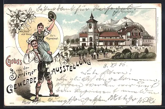 Lithographie Berlin-Treptow, Gewerbe-Ausstellung 1896, Alpenpanorama, Liebespaar in Tracht