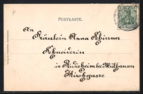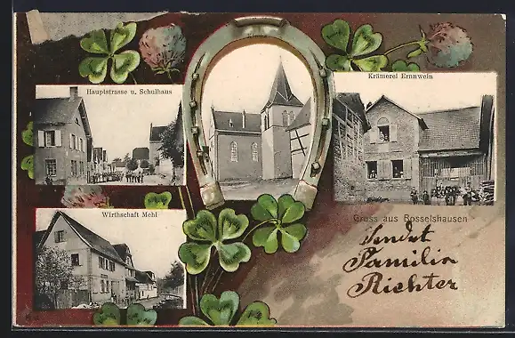 Lithographie Bosselshausen, Krämerei Ernnwein, Gasthaus Mehl, Hauptstrasse und Schulhaus, Kirche, Passepartout