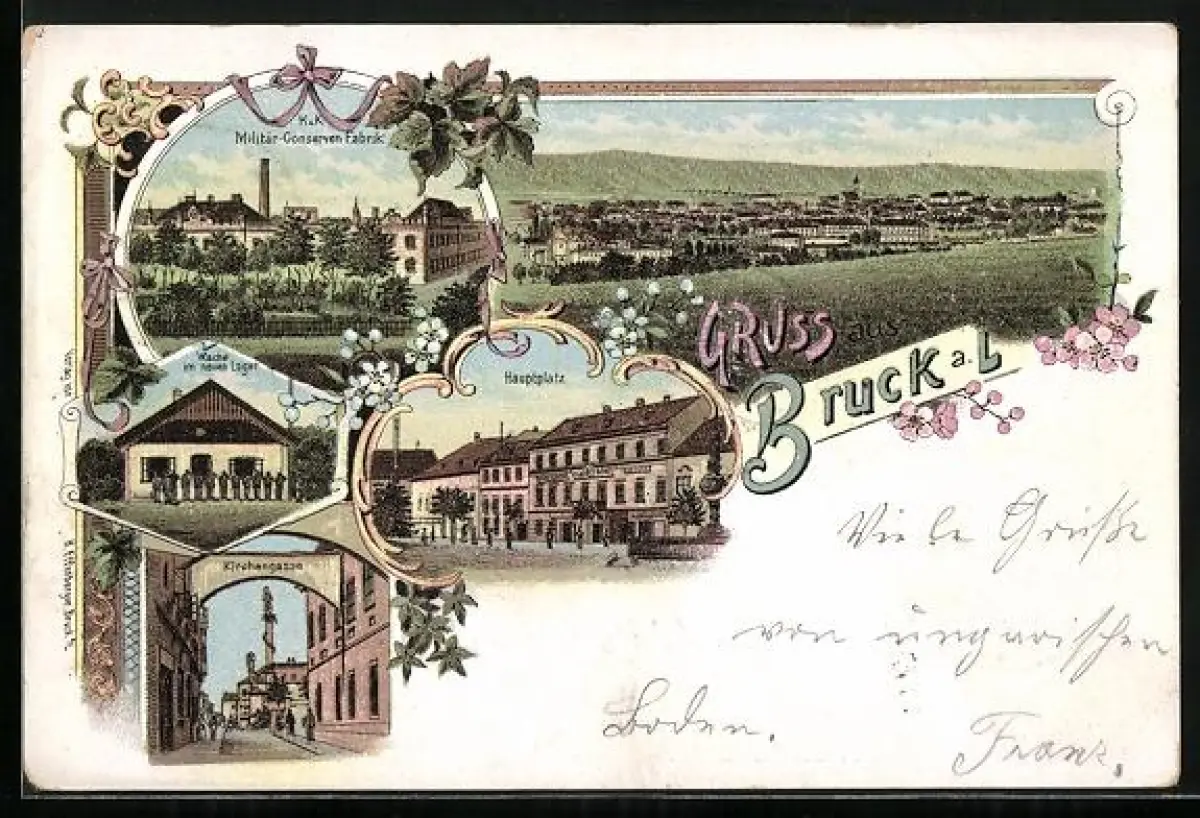 Lithographie Bruck a. Leitha, K.u.K. Militär-Conservenfabrik, Kirchengasse, Hauptplatz, Wache im neuen Lager