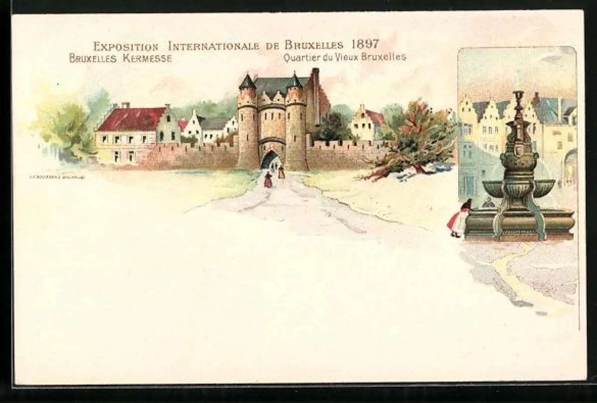 Lithographie Bruxelles, Exposition Internationale 1897, Bruxelles Kermesse, Quartier du Vieux Bruxelles