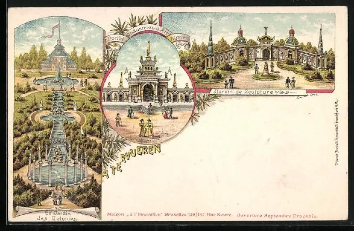 Lithographie Bruxelles, Tervueren, le Jardin des Colonies, Industries d`Art, Jardin de Sculpture