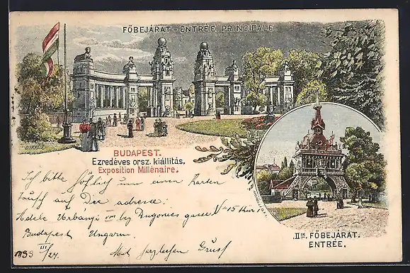 Lithographie Budapest, Exposition Millenaire, Entree Principale, II. Föbejarat Entree