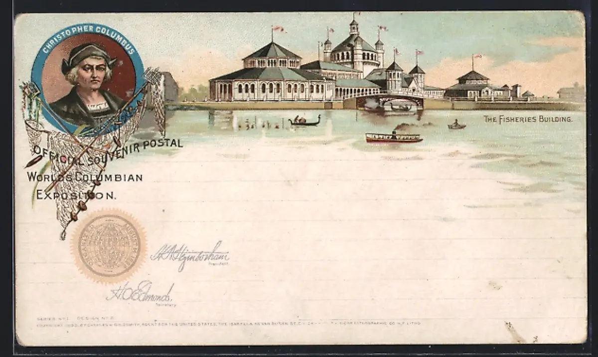Lithographie Chicago, Worlds Columbian Exposition, The Fisheries Building, Christopher Columbus