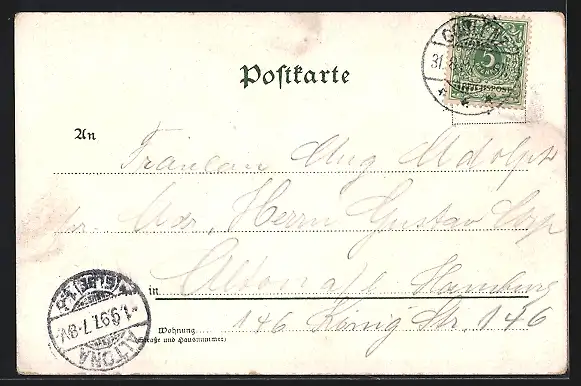 Personenbezogene Daten auf der Rückseite der Karte wurden durch blauen Textmarker unkenntlich gemacht. Die blauen Stellen sind auf die Vorderseite durchgeweicht und wirken sich negativ auf das Postkartenfoto aus