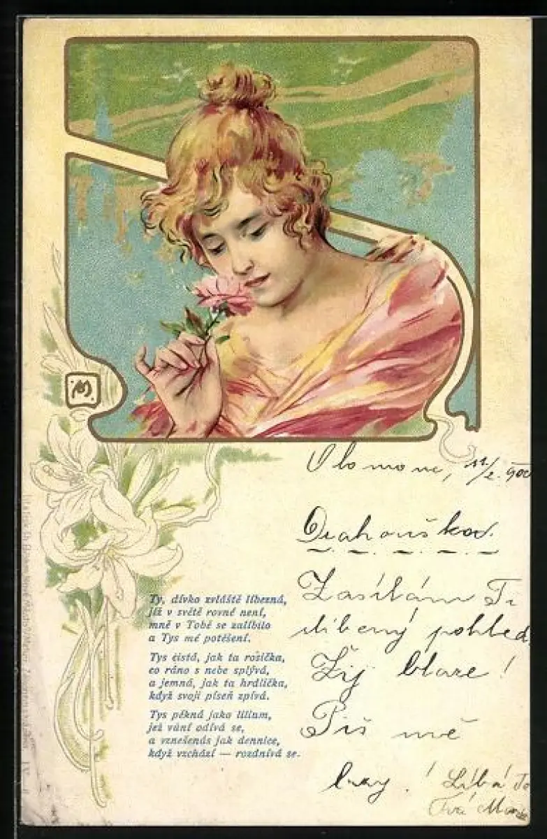 Lithographie Dame riecht an einer Blume