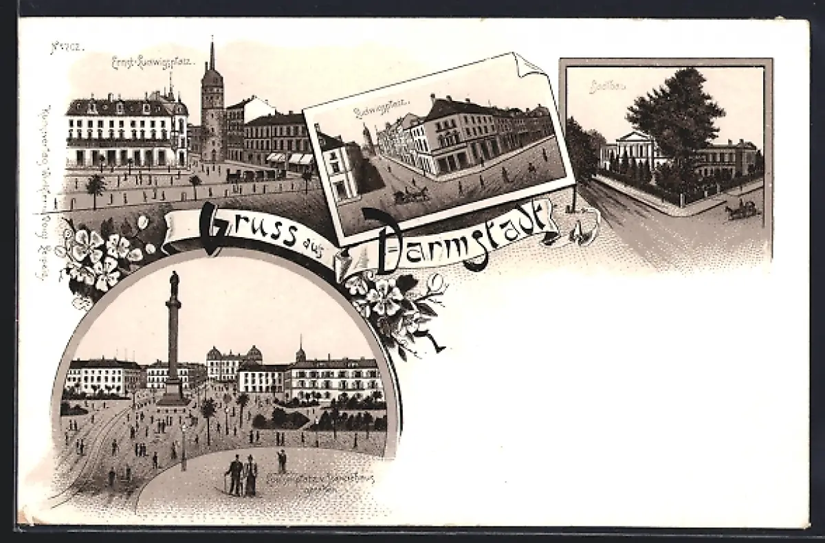 Lithographie Darmstadt, Ernst-Ludwigsplatz, Luisenplatz, Garten
