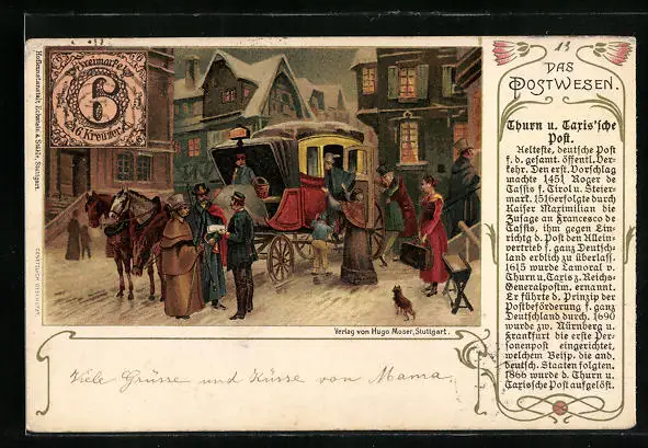 Personenbezogene Daten auf der Rückseite der Karte wurden durch blauen Textmarker unkenntlich gemacht. Die blauen Stellen sind auf die Vorderseite durchgeweicht und wirken sich negativ auf das Postkartenfoto aus