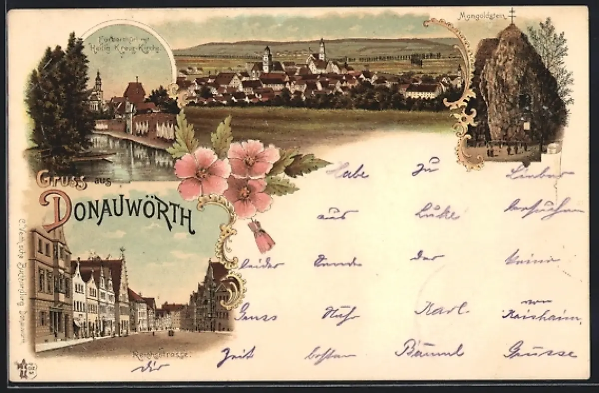 Lithographie Donauwörth, Förberthürl mit Heilig Kreuz-Kirche, Mangoldstein, Reichsstrasse