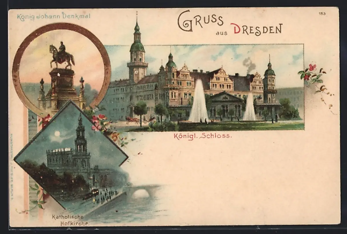 Lithographie Dresden, Königl. Schloss, König Johann-Denkmal, Katholische Hofkirche