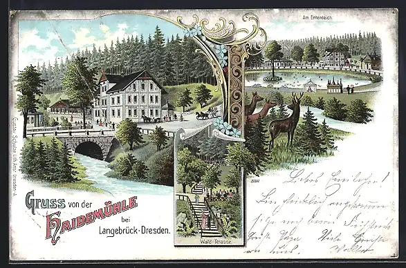 Lithographie Dresden-Langebrück, Gasthof zur Haidemühle, Waldterrasse und Ententeich